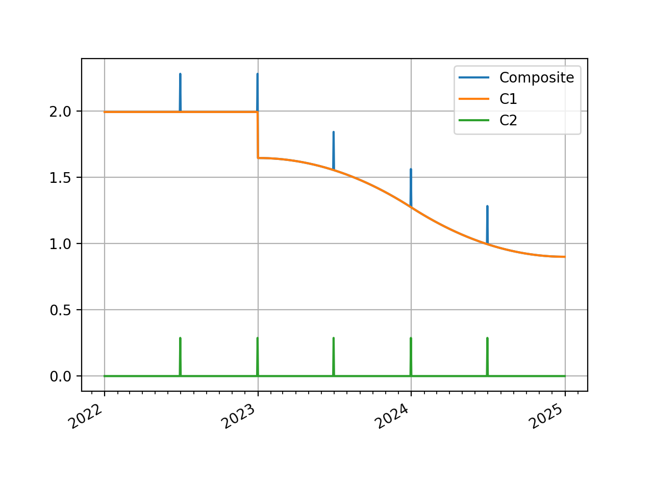 In [6]: from rateslib.curves import Curve, CompositeCurve In [7]: curve1 = Curve( ...: nodes={ ...: dt(2022, 1, 1): 1.0, ...: dt(2023, 1, 1): 0.98, ...: dt(2024, 1, 1): 0.965, ...: dt(2025, 1, 1): 0.955 ...: }, ...: t=[dt(2023, 1, 1), dt(2023, 1, 1), dt(2023, 1, 1), dt(2023, 1, 1), ...: dt(2024, 1, 1), ...: dt(2025, 1, 1), dt(2025, 1, 1), dt(2025, 1, 1), dt(2025, 1, 1)], ...: ) ...: In [8]: curve2 =Curve( ...: nodes={ ...: dt(2022, 1, 1): 1.0, ...: dt(2022, 6, 30): 1.0, ...: dt(2022, 7, 1): 0.999992, ...: dt(2022, 12, 31): 0.999992, ...: dt(2023, 1, 1): 0.999984, ...: dt(2023, 6, 30): 0.999984, ...: dt(2023, 7, 1): 0.999976, ...: dt(2023, 12, 31): 0.999976, ...: dt(2024, 1, 1): 0.999968, ...: dt(2024, 6, 30): 0.999968, ...: dt(2024, 7, 1): 0.999960, ...: dt(2025, 1, 1): 0.999960, ...: }, ...: ) ...: In [9]: curve = CompositeCurve([curve1, curve2]) In [10]: curve.plot("1D", comparators=[curve1, curve2], labels=["Composite", "C1", "C2"]) Out[10]: (<Figure size 640x480 with 1 Axes>, <Axes: >, [<matplotlib.lines.Line2D at 0x1128fa710>, <matplotlib.lines.Line2D at 0x1128fa850>, <matplotlib.lines.Line2D at 0x1128fa990>])
