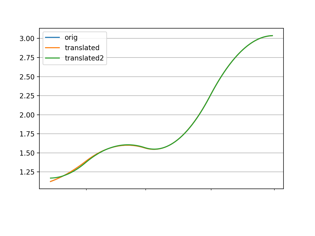 targument. Preserving the knot dates preserves the interpolation of the curve. A knot sequence for a mixed curve which begins afterstartwill not be affected in either case.In [6]: curve = Curve( ...: nodes={ ...: dt(2022, 1, 1): 1.0, ...: dt(2022, 2, 1): 0.999, ...: dt(2022, 3, 1): 0.9978, ...: dt(2022, 4, 1): 0.9963, ...: dt(2022, 5, 1): 0.9940 ...: }, ...: t = [dt(2022, 1, 1), dt(2022, 1, 1), dt(2022, 1, 1), dt(2022, 1, 1), ...: dt(2022, 2, 1), dt(2022, 3, 1), dt(2022, 4, 1), ...: dt(2022, 5, 1), dt(2022, 5, 1), dt(2022, 5, 1), dt(2022, 5, 1)] ...: ) ...: In [7]: translated_curve = curve.translate(dt(2022, 1, 15)) In [8]: translated_curve2 = curve.translate(dt(2022, 1, 15), t=True) In [9]: curve.plot("1d", left=dt(2022, 1, 15), comparators=[translated_curve, translated_curve2], labels=["orig", "translated", "translated2"]) Out[9]: (<Figure size 640x480 with 1 Axes>, <Axes: >, [<matplotlib.lines.Line2D at 0x1138c42d0>, <matplotlib.lines.Line2D at 0x1138c4410>, <matplotlib.lines.Line2D at 0x1138c4550>])
