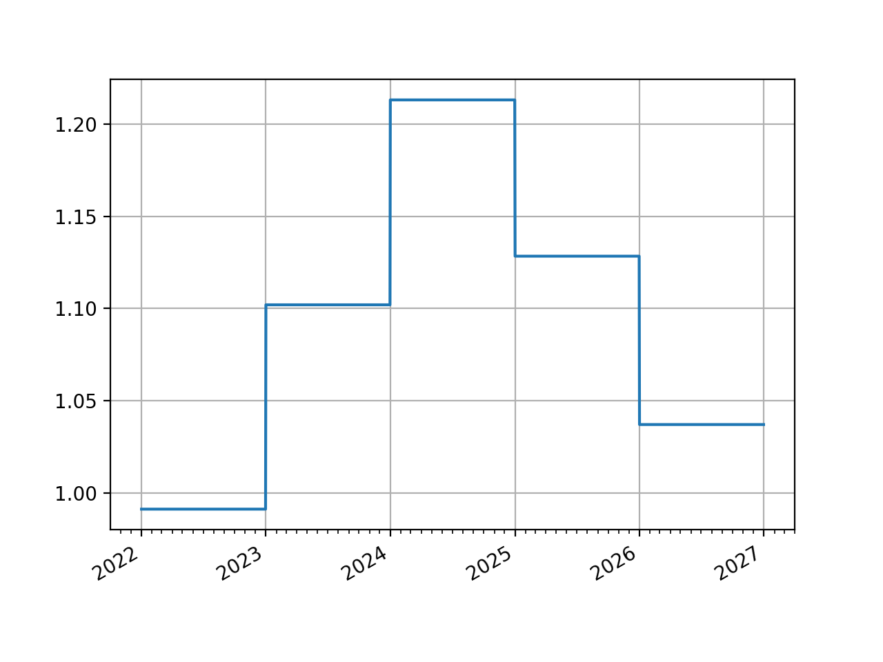 In [1]: curve = Curve( ...: nodes={ ...: dt(2022,1,1): 1.0, # <- initial DF should always be 1.0 ...: dt(2023,1,1): 0.99, ...: dt(2024,1,1): 0.979, ...: dt(2025,1,1): 0.967, ...: dt(2026,1,1): 0.956, ...: dt(2027,1,1): 0.946, ...: }, ...: interpolation="log_linear", ...: ) ...: In [2]: curve.plot("1d") Out[2]: (<Figure size 640x480 with 1 Axes>, <Axes: >, [<matplotlib.lines.Line2D at 0x112afad50>])
