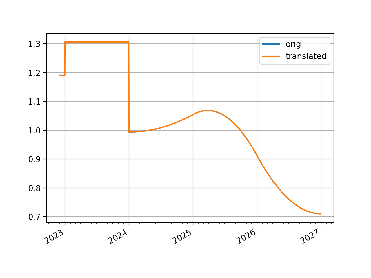 In [4]: curve.nodes Out[4]: {datetime.datetime(2022, 1, 1, 0, 0): 1.0, datetime.datetime(2023, 1, 1, 0, 0): 0.988, datetime.datetime(2024, 1, 1, 0, 0): 0.975, datetime.datetime(2025, 1, 1, 0, 0): 0.965, datetime.datetime(2026, 1, 1, 0, 0): 0.955, datetime.datetime(2027, 1, 1, 0, 0): 0.9475} In [5]: translated_curve.nodes Out[5]: {datetime.datetime(2022, 12, 1, 0, 0): 1.0, datetime.datetime(2023, 1, 1, 0, 0): 0.9989751829682344, datetime.datetime(2024, 1, 1, 0, 0): 0.9858307726660208, datetime.datetime(2025, 1, 1, 0, 0): 0.9757196878181642, datetime.datetime(2026, 1, 1, 0, 0): 0.9656086029703076, datetime.datetime(2027, 1, 1, 0, 0): 0.9580252893344151}