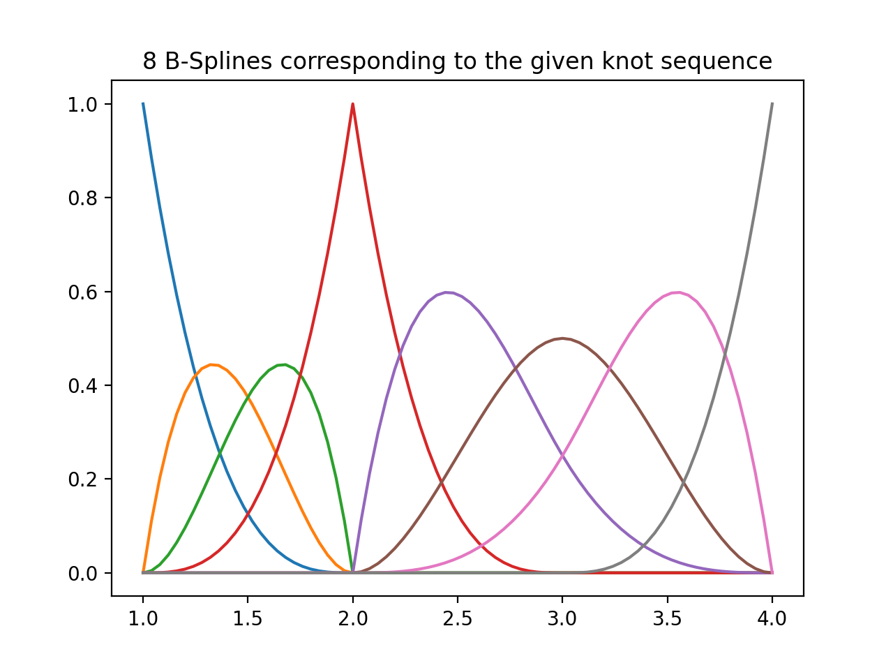 Below we plot the 8 b-splines associated with the example knot sequence,
