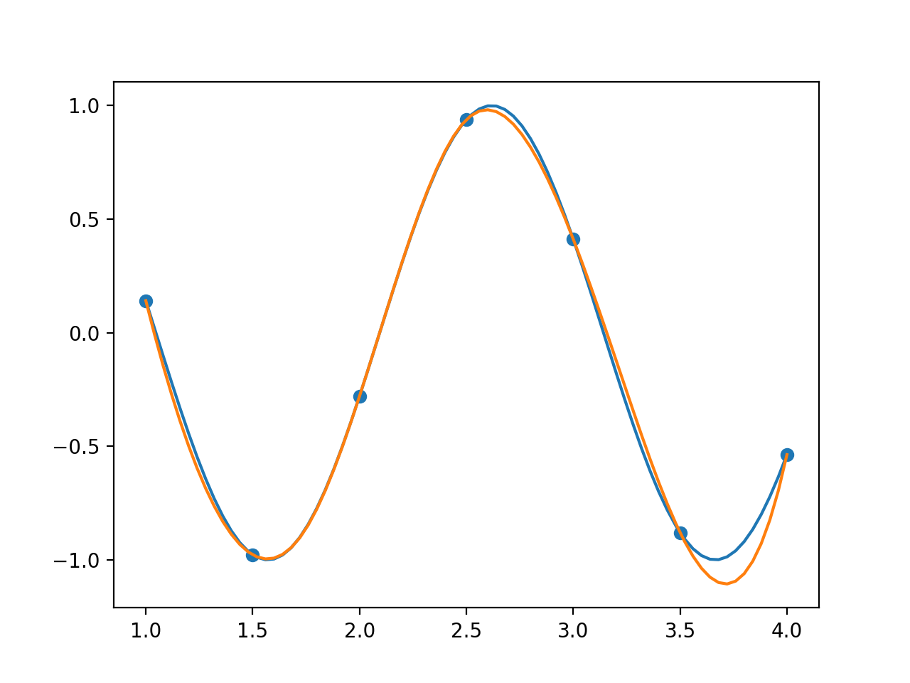 Suppose we now have a function, \(g(x)\), within the domain [1,4], eg \(g(x)=sin(3x)\) and we sample 8 data sites, \(\mathbf{\tau}\), within the domain for the function value: