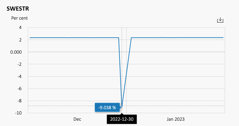 The following image is an example of an index, the Riksbank’s SWESTR, which is impacted to an excessive degree by the government’s fiscal policy of applying taxes and fees based on the size of a Swedish bank’s liabilities at year end. In order to either shrink its liabilities or accrue an amount from a depositor that covers the fee, a Swedish bank adjusts its overnight deposit rate for this one day of the year. Because of the scale, any daily variation of regular amplitude at around 2.30%-2.31% is not visible and the curve appears completely flat, but it is not. Data is available on the Riksbank’s website.