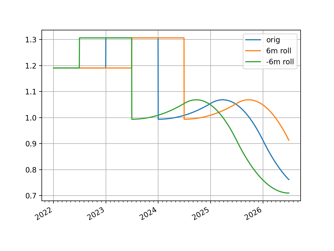 In [1]: curve = Curve( ...: nodes = { ...: dt(2022, 1, 1): 1.0, ...: dt(2023, 1, 1): 0.988, ...: dt(2024, 1, 1): 0.975, ...: dt(2025, 1, 1): 0.965, ...: dt(2026, 1, 1): 0.955, ...: dt(2027, 1, 1): 0.9475 ...: }, ...: t = [ ...: dt(2024, 1, 1), dt(2024, 1, 1), dt(2024, 1, 1), dt(2024, 1, 1), ...: dt(2025, 1, 1), ...: dt(2026, 1, 1), ...: dt(2027, 1, 1), dt(2027, 1, 1), dt(2027, 1, 1), dt(2027, 1, 1), ...: ], ...: ) ...: In [2]: rolled_curve = curve.roll("6m") In [3]: rolled_curve2 = curve.roll("-6m") In [4]: curve.plot( ...: "1d", ...: comparators=[rolled_curve, rolled_curve2], ...: labels=["orig", "6m roll", "-6m roll"], ...: right=dt(2026, 6, 30), ...: ) ...: Out[4]: (<Figure size 640x480 with 1 Axes>, <Axes: >, [<matplotlib.lines.Line2D at 0x1160a0a50>, <matplotlib.lines.Line2D at 0x1160a0b90>, <matplotlib.lines.Line2D at 0x1160a1e50>])