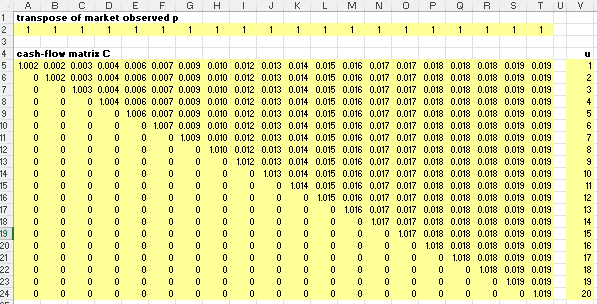 The standard EIOPA example happens to include a 20x20 cashflow matrix, each bond valued at par with increasing coupon rates, implying increasing YTM.